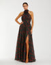 Black Floral Print Halter Neck Gown with Rosette Detail