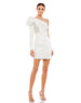 One-sleeve form-fitting satin mini dress with an inset waist and dramatic bow accent at the shoulder.